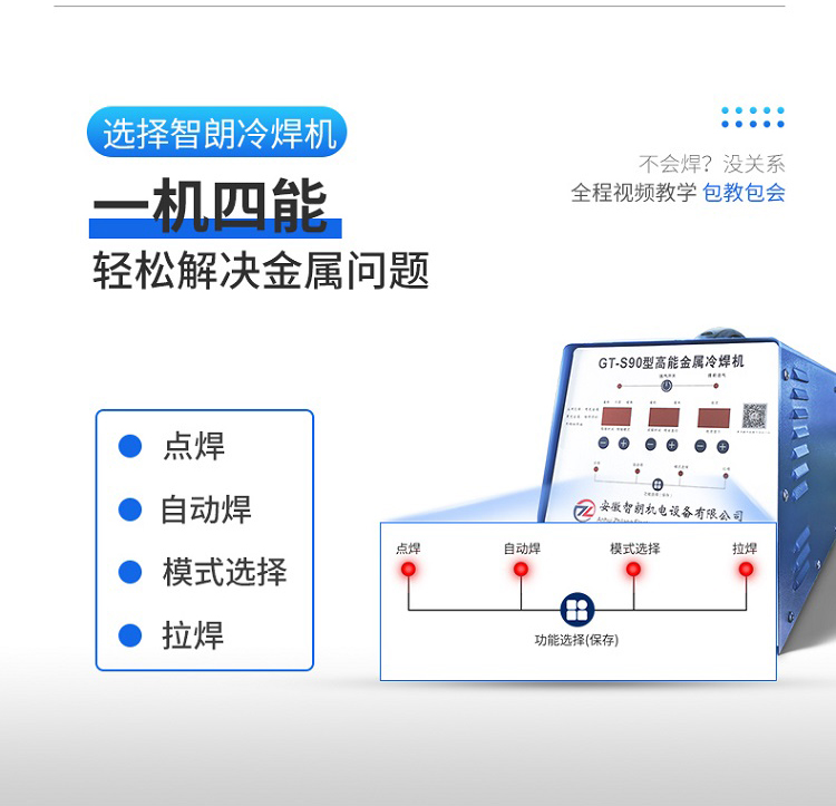 GT-S90高能金屬冷焊機是采用大功率逆變電源技術(AC-DC-AC-DC),把市電轉換成低電壓,大電流的直流電源,使其達到我們所需要的焊接電源條件,再通過微電腦技術,對焊接的時間進行精確的控制。該機是目前市場功率較大的機器,因功率比較大所以焊補速度是市場上傳統焊機的數倍以上,該機采用CPU控制,實現了脈沖電壓和時間的可調及儲存。從而可以根據工件焊后的缺陷特點調節到高效焊接和焊補功率,使焊機的焊接和焊補精度可以達到甚至超過激光焊機的焊接和焊補精度,同時又兼有氬焊的速度及靈活性。