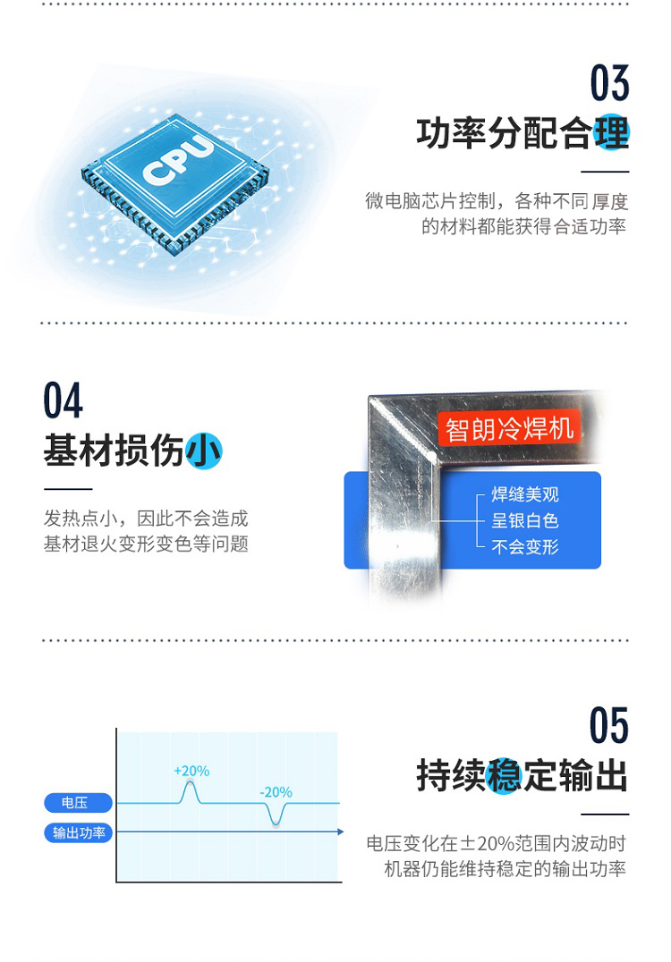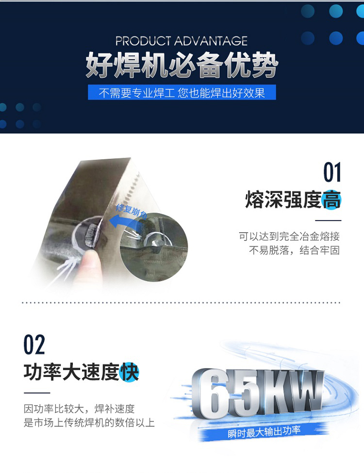 該設備體積小、功率大、效率高,針對傳統行業對焊工的高要求水準,該焊機對無操作經驗者均可快速上手,焊點呈現銀白色,后期無需打磨拋光