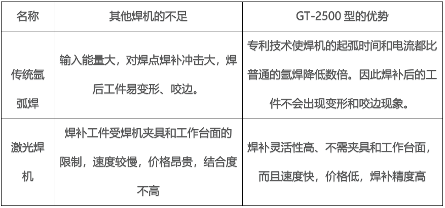 本設備可將儲存于電容器中的電能在瞬間通過脈沖電弧的形式釋放于鎢極與工件之間,溫度極高的電弧使金屬材料組成的工件和焊絲迅速熔化而熔接在一起,達到焊接焊補目的。高頻放電,瞬間放弧。優點是:功率大、修補速度快、可廣泛應用于各種鋼鐵、銅、鋁及相關合金的焊接和修補,特別適用于較大量的修補。